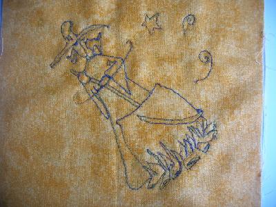 Nun hatte ich noch nie gestickt, hatte kein Stickgarn da und hab es erstmal mit Wolle probiert... Das Ergebnis war einfach grauenvoll Also hab ich mit dem kleinsten Stich den meine Nähmaschine hergab und Quiltgarn einfach die Hexe auf dem Stoff "nachgenäht". Das Gelbe vom Ei war das nun auch nicht - aber immerhin akzeptabel. Bevor die Hexe fertig war, war zu allem Überfluss das Garn alle...