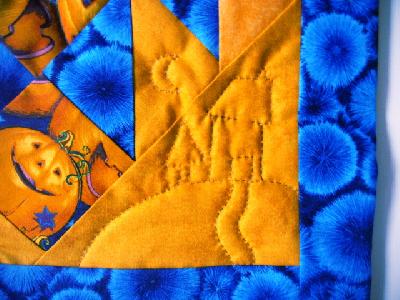 Gequiltet habe ich ein Spinnennetz, Fledermäuse, ein Hexenhäuschen (da kann ja auch die Katze drin wohnen...) und einen Kürbis.