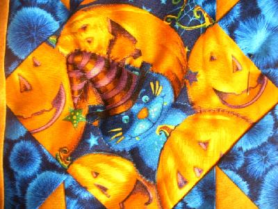 Also das Blau gefällt mir persönlich nicht so, ist viel zu grell und als Kontrast zum Orange hätte mir ein dunkleres - oder eben klassisch schwarz zu Halloween - besser gefallen. Aber das Muster und vor allem die süße Katze und die tollen Quiltmotive (!!!) sind einfach superschön!