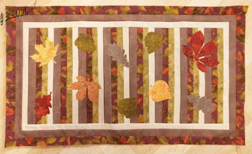 Die gleichen 4 Farben habe ich dann auch noch für den äußeren Rand genommen, wobei die 4. Farbe dann das Binding wird. Gefiel mir schon mal für's erste ganz gut, aber irgendwie sah das ganze noch ein wenig kahl aus. Die Lösung hatte ich in anbetracht der bevorstehenden Jahreszeit schnell gefunden. Blätter müssen noch drauf, dann müßte es passen .... ?! Es paßte und jetzt gefällt mir das Top echt gut.