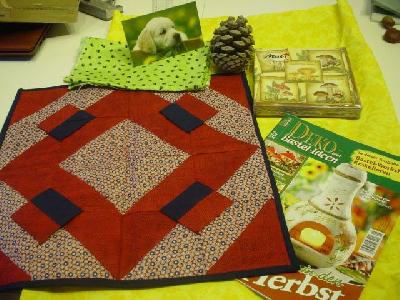 Das ist eine gewünschte kleine Decke für unseren Eßtisch im Wohnzimmer und ein tolles Fat Quarter, Pilzservietten (die werden sich toll auf unserem Tisch machen) und ein riesiger Zapfen und zu allerletzt noch die Bastelzeitschrift. Ich bin reich beschenkt und freue mich ganz besonders über die hübsche Arbeit in blau/rot. Vielen Dank und da man raten soll und die Grüße aus dem Erzgebirge kommen, tippe ich auf