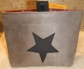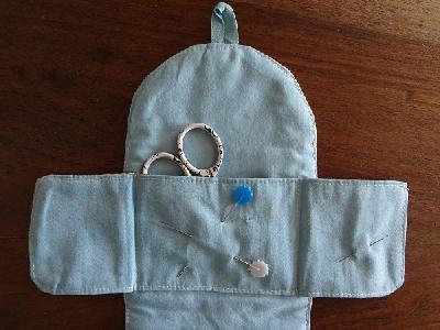 Das hintere Täschchen ist übrigens so bemessen, dass eine kleine Schere und etwas Faden reinpasst, so könntet Ihr es aus zum Reisenähset umfunktionieren. (Evtl. müsst Ihr je nach Grösse der Schere den Knopf etwas versetzen.)