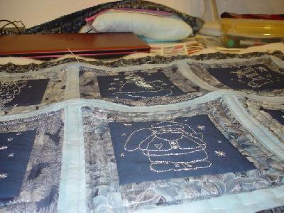 Ich bin ganz enttäuscht und mächtig traurig, denn nun habe ich mir gaaaanz viel Mühe gemacht und mein verpatztes Teil aufgetrennt und ich sage Euch, daß war eine Menge Arbeit. Dann habe ich alles geheftet und von Block zu Block gequiltet, dann dazwischen die Stege. Und nun schaut Euch das an Ich habe doch nun alles so gemacht wie empfohlen, wieso beult es sich immernoch so aus? Was habe ich falsch gemacht und wie geht es richtig???????