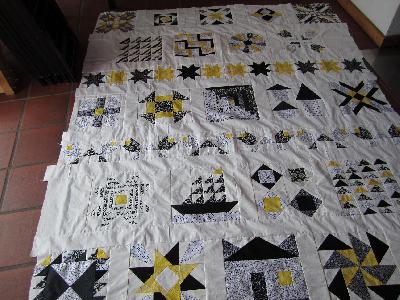 Außen herum soll noch ein etwa 15 cm breiter Rand in schwarz mit versetzten Flying Geese. Damit hab' ich am Mega-Nähwochenende im Spessart angefangen. Die Ernüchterung beim nächsten Besuch im PW-Laden, der schwarze Stoff ist aus. Also erst mal warten auf Nachschub. Gott sei Dank ist der Rand oben und unten fertig. Stoffwechsel kann somit zur Absicht erklärt werden. Quilten hab' ich mir für den Winter vorgenommen. Wird wohl ne längere Sache werden.