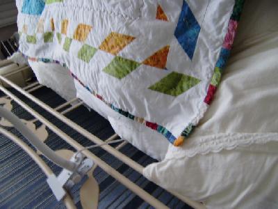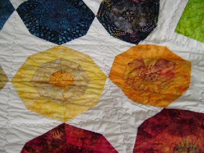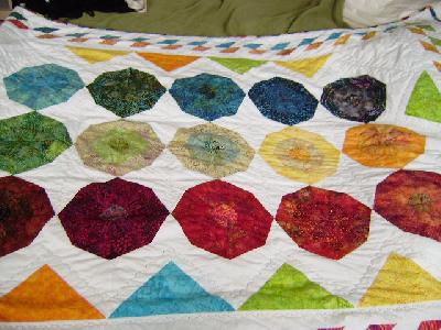 Also zum enen muß ich sagen "bunt" kannst du sehr gut. Ich finde ihn ganz toll (besonders, weil ich selber gerade meinen ersten Mini-Spider genäht habe) auch die Rauten-Lösung ist Klasse, mal ganz was anderes. Beim ersten Bild dachte ich noch, das wirkt nur schräg, weil das Bild schräg aufgenommen ist aber es sind ja tatsächlich Rauten. Auch das bunte Binding rundet das ganze schön ab, also rundum gelungen.