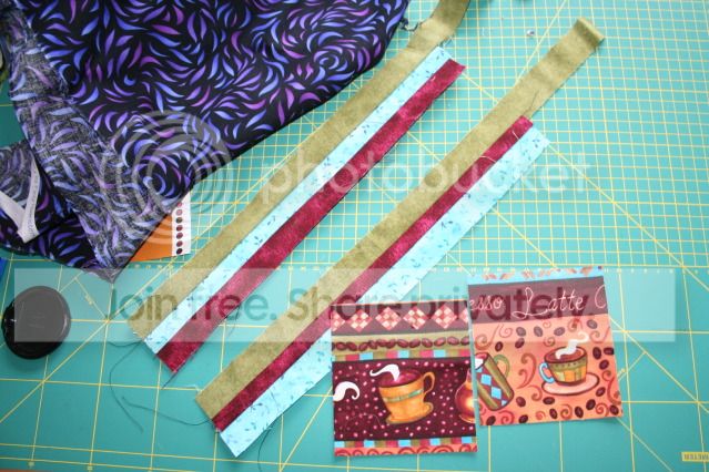 Ich finde auch das Blau geht. (Fuer mich passt das Lila gar nicht denn so dunkel ist nichts im Bild) Wie war's wenn du aus den Streifen Quadrate schneidest und diese im 90 Grad Winkel gedreht wieder aneinandernaehst? Dann kannst du daraus z.b. eine Borduere machen und entweder einen farblich passenden Stoff zu den Kaffeetassenbloeckchen dazulegen. Dieser Stoff kann dann in groesseren Stuecken genommen werden so dass die Kaffeetassen und die Borduere besser vorsteht.