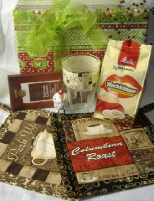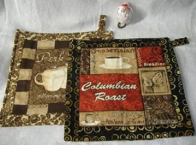 Kaffee-Pads mit vielversprechendem Namen und zwei Topflappen,