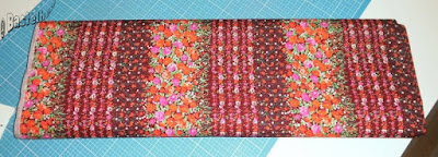 Ich habe mir ca. 60 cm abgeschnitten (zum testen reichte das schon mal) und daraus Streifen mit 1. bunten Blümchen und 2. mit den Streifenblümchen zugeschnitten und aus den Streifen dann die Dreiecke.