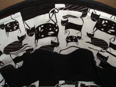 Innen in der Tasche tummeln sich natürlich auch noch Katzen, außerdem gibts eine Innentasche über die ganze Breite, unterteilt in 4 kleine Täschchen: