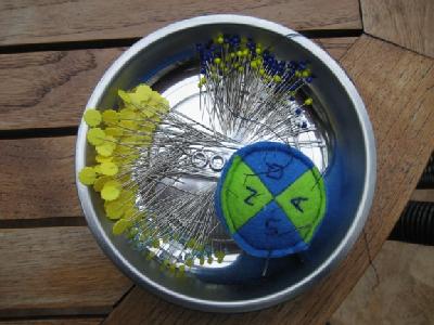 Außerdem hab ich so eine große Magnetschale für Stecknadeln. Dazu hab ich neulich ein Nadelkissen genäht mit einer Metallscheibe untendrin. Dadurch haftet das Nadelkissen auch in der Schale, und es ist so niedrig, dass mir die Quiltnadeln nicht dauernd drin verschwinden wie bei allen meinen anderen Nadelkissen. Außerdem hat es vier Unterteilungen zur Unterscheidung von Näh– Stick– Appli– und Quiltnadeln.