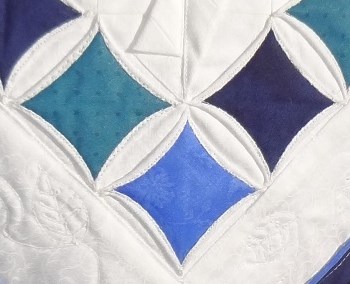 Die farbigen Fenster sind von Hand eingenäht. Das war ziemlich kniffelig, weil ich ja kaum Zugaben geben konnte. Nun habe ich sie per freihand quilten noch etwas gesichert.