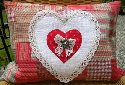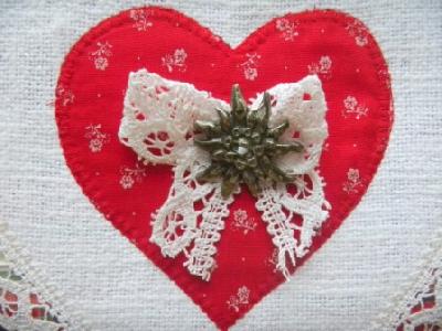 Von diesen rechteckigen Musterteilchen hatte ich noch welche in rot/beige/weiß kariert und gestreift. Also gibt es noch ein Kissen, diesmal mit ordentlich Deko in Form eines großen applizierten Herzens aus ganz grobem Leinen mit Spitze rundherum und im Zentrum ein Edelweißknopf.