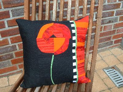 Da kannst du auch wirklich stolz sein, das Kissen ist wunderschön geworden. Ich habe so eine Mohnblume als Wandbehang genäht. Deins wirkt aber komplett anders, weil du das orange/gelb mit reingenommen hast.
