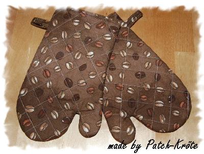Meine Mama brauchte neue Backofenhandschuhe. Die Alten waren schon so igittigit und an allen Ecken und Enden geflickt, dass es kein Luxus war sich neue zu wünschen. Nachdem die hier fertig waren, wurden die alten in der grauen Tonne bestattet. Ich hab auf jeder Seite Thermolam doppelt genommen, so sollte man sich die Finger nicht verbrennen (hoffe ich zumindest)