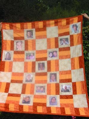 Das ist eine Kniedecke, die ich meiner 'Schwiegerma zu ihrem 80sten Geburtstag genäht habe. All ihre Lieben um sie herum.