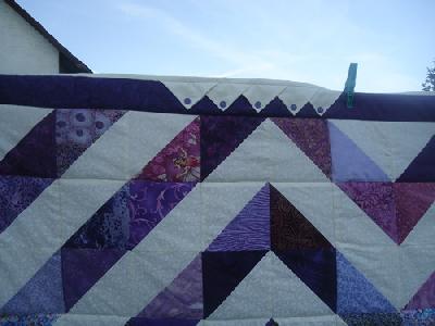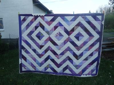 Am 10.05.2015 geht mein Patenkind Julia zur Konfirmation - und wie alle meine Nichten bekommt auch Sie unter anderem einen Quilt - Julia's Mama hat mir verraten das ein lila Quilt gut ankommen würde - also habe ich im vergangen Jahr schon mal angefangen lila Stöffchen zu sammeln - und habe mich für ein Dreieck Muster entschieden - auf den Seitenstreifen habe ich noch 12 prairie points eingefügt und noch 12 kleine lila Knöpfchen darauf gesetzt. Jetzt fehlt mir nur noch ein schöner Name für den Quilt - vielleicht hat ja von euch jemand eine schöne Idee ??? Dann bekommt er noch sein Label und wäre dann Geschenkbereit!!