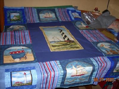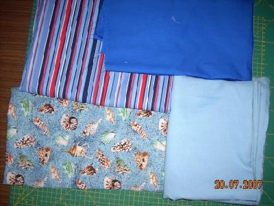 so war nochmal Stoffe kaufen und denke das ich jetzt alle habe. Den gestreiften und den royalbleuen hatte ich noch liegen, aber der hellblaue und der Muschelstoff fanden heute den Weg in meine Tasche. Hab ja noch 8 Blöcke mit kleinen Leuchttürmen in der Mitte und die werden nun mit den vier Stoffen am Quilt weiterverarbeitet. Wie ich genau vorgehen werde entzieht sich im moment noch meiner Kenntnis, aber hab ja noch Zeit um das auszutüfteln.