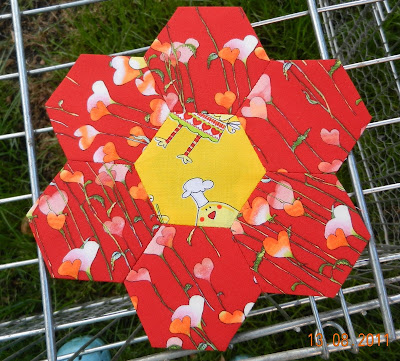 Eine andere Lösung ist die, wie Sie in dem Buch beschrieben ist. Mach dir eine schablone mit 3 bis 4 sechsecken inklusive nahtzugabe nebeneinander und zeichne so auf... Ist einfacher als alle einzeln aufzuzeichnen. |