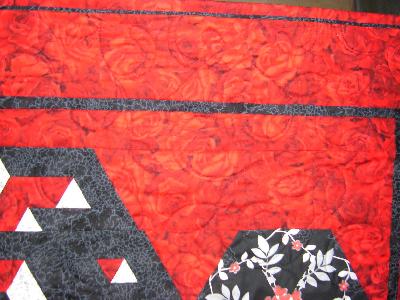 Gequiltet wurden Ranken mit schwarzem Garn - was man natürlich auf dem Gesamtbild wieder nicht sieht und auf dem Detailfoto nur andeutungsweise. In echt ist es wirklich sehr schön geworden und das schwarze Garn auf dem roten Stoff sieht echt toll aus.