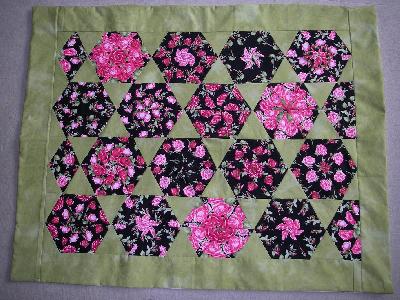 Jetzt hab ich es geschafft, mein zweiter Kaleidoskop ist fertig (nur noch quilten) diesmal mit Zwischendreiecken, da der Stoff so dunkel war: