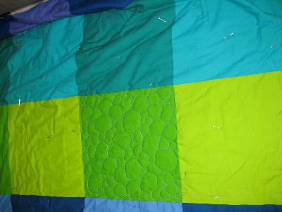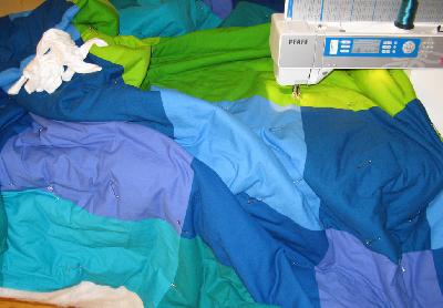 Jetzt zu Hause habe ich keine Lust, an einem kleinen Mustertuch zu quilten, also habe ich mir ein 'richtiges' Muster gemacht - zwei Lagen Stoff und dazwischen ein schönes Wollvlies, das auch in die Wama darf. Da ich keine schwere Bettdecke haben will, ist das Muster (große Karos) aufgedruckt und nicht gepatcht - damit habe ich wirklich nur zwei Lagen Stoff und das Vlies. Zusammengefügt habe ich es quer auf meinem Bett liegend mit Sicherheitsnadeln - das ging besser als ich es erwartet hatte. Die Sicherheitsnadeln versetze ich jeweils an den Rand eines Karos, wenn ich quilte.