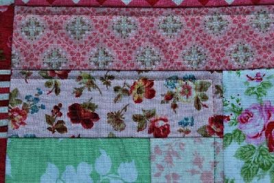 Ferra, ich habe eine Art "Treppenmotiv" gequiltet, und zwar etwa 7 mm neben der Nahtlinie entlang der Rechtecke. Die Quadrate blieben ungequiltet.