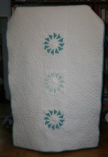 Daher das eher schlichte Muster, wenig Farbe (für mich) und ein blumig-aufwendiges Quiltmuster.