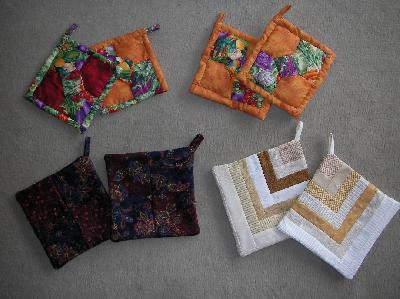 dann die dunklen aus Stoffresten von der Tasche meiner Schwester nach dem genialen Muster von Quiltoma (8-Minuten-Topflappen) zwar sehr viel Stoffverbrauch (6 mal das Quadrat) dafür aber am schnellsten und als letztes die Reste von 2 beige-braunen Decken. Die waren so klein, das ich den ganzen Nachmittag beschäftigt war (jetzt würde es nicht mal mehr für einen reichen)