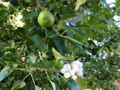 Auf dem Foto zeigt unser Apfelbaum, das er multitasking ist- Blüten und Früchte zur selben Zeit.