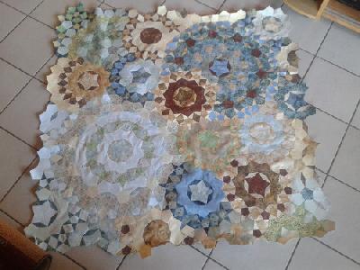 Es war gar nicht so einfach, ein Ende zu finden, weil man hier keine geraden Maße hat. Am fitzelichsten ( gibt's das Wort eigentlich?) war es die Lücken am Rand zu füllen, die durch die "Rundungen" der Rosetten entstanden sind. Mit dem Ergebnis bin ich jetzt so zufrieden, mal sehen, wie es dann an der Wand aussieht. ( ca. 1,40 m x 1,40,m)
