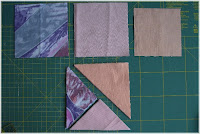 Um diese Dreiecke zu erhalten schneide ich mir aus Rosa und Bunt je zwei Quadrate von 3,5 x 3,5 Inch (ca. 8,9 cm) zu. Diese Teile ich dann Diagonal und erhalte so je Farbe 4 gleich große Dreiecke.