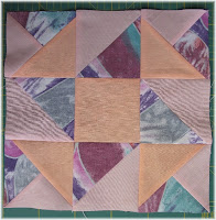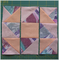 Muster zusammen legen und wie schon bei den anderen Mustern Reihe für Reihe die Quadrate zusammen nähen und dann die Reihen. Darauf achten, das die Nahtzugabe der Reihen in wechsel Richtung gebügelt wird. Auch dieses Muster kann man schon für eine PW Arbeit als Einzelblock verwenden ohne es zu teilen.