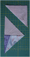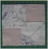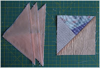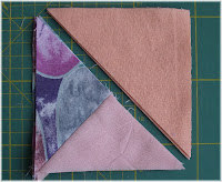 Nun kommen die Apriko farbenen Dreiecke auf die so eben entstandenen zweifarbigen Dreiecke. Diese werden an der langen Seite zusammen genäht. Hier wird die Nahtzugabe zum Apriko farbenen Dreieck umgebügelt. Diese Quadrate jetzt auf die passende Größe 4 x 4 Inch zurecht schneiden.