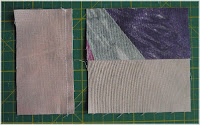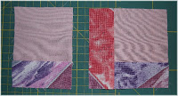 Das arbeiten dieses Blockes ist nicht schwer. Zuerst nähen wir an die kleinen Quadrate die kurzen Streifen. Die Nahtzugabe wird zum Streifen umgebügelt. Jetzt den langen Streifen. Hier muss man darauf achten, das man den langen Streifen wenn man die 4 fertigen Quadrate vor sich liegen hat immer inne liegen hat und eben so die kurzen Streifen. Die Nahtzugabe wieder zum Streifen umbügeln.