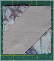 Für die zweifarbigen Quadrate nehmen wir die 4,5 x 4,5 Inch großen Quadrate und legen je ein Uni und ein Buntes rechts auf rechts übereinander. Auf der oberen Seite wird eine Diagonale eingezeichnet sie dient als Hilfslinie. Es wird nun ober und unterhalb der Hilfslinie in einem Abstand zu dieser von 1/4 Inch (6 mm) entlang genäht. Entlang der Hilfslinie nun das Quadrat teilen.Das zweite Quadrat genau so arbeiten und auch teilen. Wer sich mit der Nahtbreite nicht sicher genug ist kann da auch eine Hilfslinie einzeichnen auf der er dann näht. Die Nahtzugabe noch umbügeln und die kleinen überstehenden Ecken abschneiden.