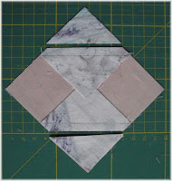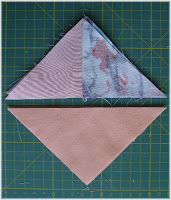 Das selbe machen wir auch mit dem Stoff Nummer drei (Apriko) nur wird dieser 4,5 x 4,5 Inch (11,43 cm) zugeschnitten (2 Stück) und gleich falls diagonal geteilt.