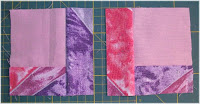 Noch einmal je zwei Quadrate in Rosa und Bunt in 4,5 x 4,5 Inch zuschneiden für die zweifarbigen Quadrate. 1 Quadrat benötigen wir für die Mitte dieses ist 4 x 4 Inch in Apriko.