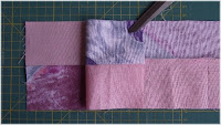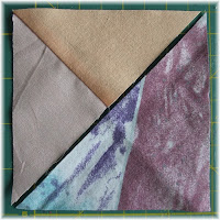 Hat man dies getan werden die kleineren Dreiecke jeweils an der kurzen Seite zusammen genäht (Nahtbreite 1/4 Inch (6 mm)). Die Naht in eine Richtung bügeln und auf das größere Dreiecke legen (rechts auf rechts) und auf der langen Seite zusammen nähen. ggf. auf 4 Inch zurück schneiden