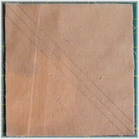 Die Quadrate für die rechte und linke Mitte und die Quadrate der obere- und untere Mitte ebenfalls einmal diagonal Teilen so das wir Dreiecke erhalten. jetzt ist es angebracht sich das Muster zurecht zu legen das man genau sehen kann wo welches Farbdreieck hin gehört.