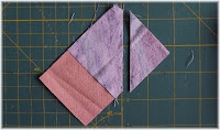 Die Quadrate werden jetzt wie die Streifen auch je ein Rosa zu Apriko und Bunt rechts auf rechts aufeinander gelegt. Eine diagonale Hilfslinie von einer zur anderen Ecke ziehen und von dieser ober und unterhalb 1/4 Inch breit entlang nähen. Auf der Hilfslinie das Quadrat teilen die Nahtzugabe umbügeln.