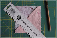 Jetzt markiere ich mir wie schon beim ersten 9ner Block jeweils die Mitte Oben, Unten, Rechts und Links, mit einem Stift oder einfach einen Zwick. Wieder das Lineal auflegen und Senkrecht auseinander schneiden. Die Teile drehen und nochmals auseinander schneiden.