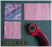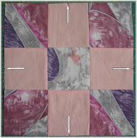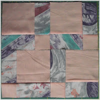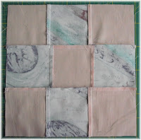Bei dem gezeigten Muster hab ich nun drei Reihen mit je drei Quadraten im wechsel (1) Rosa, Bunt, Rosa (2) Bunt, Rosa, Bunt (3) Rosa, Bunt, Rosa gelegt.