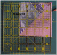 Um den Ninepatch auch gerade Senkrecht und Waagerecht zu teilen, mache ich mir in die mittleren Quadrate genau in der Mitte der äußeren Kante einen kleinen Zwick (man kann auch einen kleinen Bleistiftpunkt machen). Dann nehem ich mein Rollschneider und mein Lineal und Teile zu erst Senkrecht. Nun die Zwei Teile drehen so das man wieder Senkrecht Teilen muss. Dabei darauf achten dass die beiden Teile genau untereinander liegen als wären sie nicht durchgeschnitten.