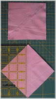 Die Größe unserer Quadrate beträgt wieder 4 x 4 Inch ( 10,16 cm). Für die zweifarbigen Quadrate schneiden wir uns von jeder Farbe je zwei Quadrate in 4,5 x 4,5 Inch (ca. 11,5 cm [11,43]) zu. Diese Quadrate werden von je einer Farbe eins, rechts auf rechts auf einander gelegt. Auf der Oberen Seite kann man sich eine Diagonale einzeichnen (von einer Ecke schräg zur anderen Ecke). Nun wird an dieser Diagonalen jeweils einmal oberhalb und unterhalb mit einer Nahtbreite von 0,5 Inch (ca. 6 mm) entlang genäht.
