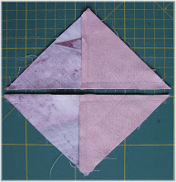Die so entstandenen zweifarbigen Quadrate werden nun so aufeinander gelegt das ein Uni und ein Buntes Dreieck übereinander liegen. Die beiden Nähte treffen sich in der Mitte und sollten gut übereinander liegen. Mit zwei Stecknadeln zusammen heften und eine Diagonale einzeichnen von der ungenähten Ecken zur anderen. Auch hier wieder ober und unterhalb der Hilfslinie 1/4 (ca 0,24) Inch (6 mm) breit abnähen. Jetzt noch auf der Hilfslinie auseinander Schneiden und man erhält zwei Quadrat bestehend aus 4 Dreiecken. Die Nahtzugaben wieder umbügeln. Das selbe mit den zweiten paar zweifarbigen Quadraten. Nun sollten 4 dieser Quadrate vor uns liegen. Die Größe der Quadrate noch prüfen die sollte nun 4 Inch betragen. ggf. nachschneiden.