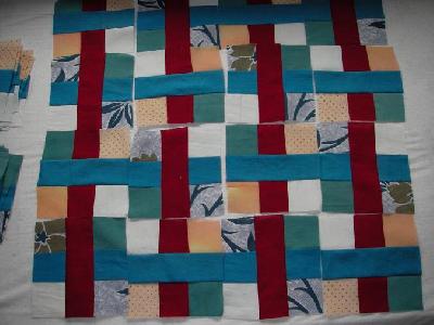 Jetzt der nächste Schritt, die Blöckchen sind "modifiziert"! Und wenn man bedenkt, daß die Stöffchen einen sehr hohen Leinenanteil haben und also dementsprechend sehr weich sind und ich außerdem dieses Muster zum allerersten Mal mache gefallt es mir sehr gut.