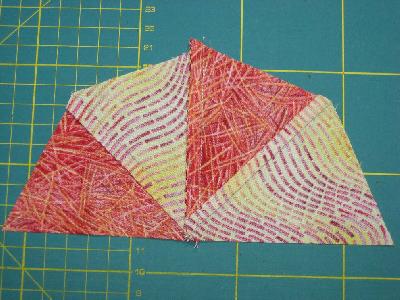 Die Dreiecke sind größer und werden erst nach dem Nähen zugeschnitten. Alle Ecken gleich nähen, gut ausbügeln und das Endteil begradigen.