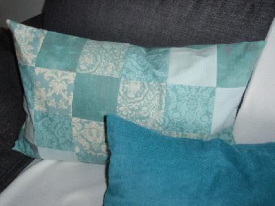 Das vordere hab ich bei einem Möbelladen M...M... für 2,99 inkl. Füllung gekauft, das große hinten 40 x 60 ist aus div. hellen mintgrünen Stoffen mit beige - also Winterfarben.