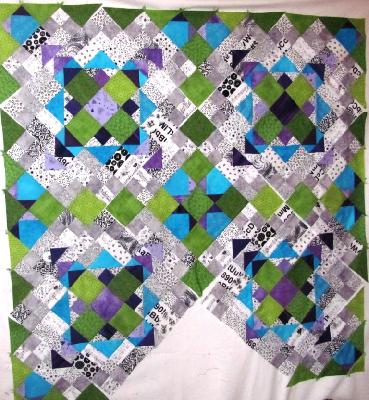 der ganze Quilt ist 4 x 4 Blöcke und ich nähe 4 x 2 Blöcke. Das ergibt dann ca. eine Größe von 1 x 2m statt 2 x 2m. Dann kommt noch Rand dran und Seminole und... Ich komme dann ca. auf 2,20 x 1,50m.
