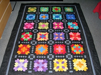 Nachdem mein Quilt über ein Jahr in der Ecke gelegen hat, weil ich nicht wußte, wie ich ihn quilten sollte, ist er nun endlich fertig. Eigentlich wollte ich ihn, wie den Rest des Quilts von Hand quilten, aber mit dem schwarzen Stoff kriegen meine Augen das abends nicht mehr hin. Also habe ich mich endlich zu einer einfachen Lösung mit der Maschine entschieden.